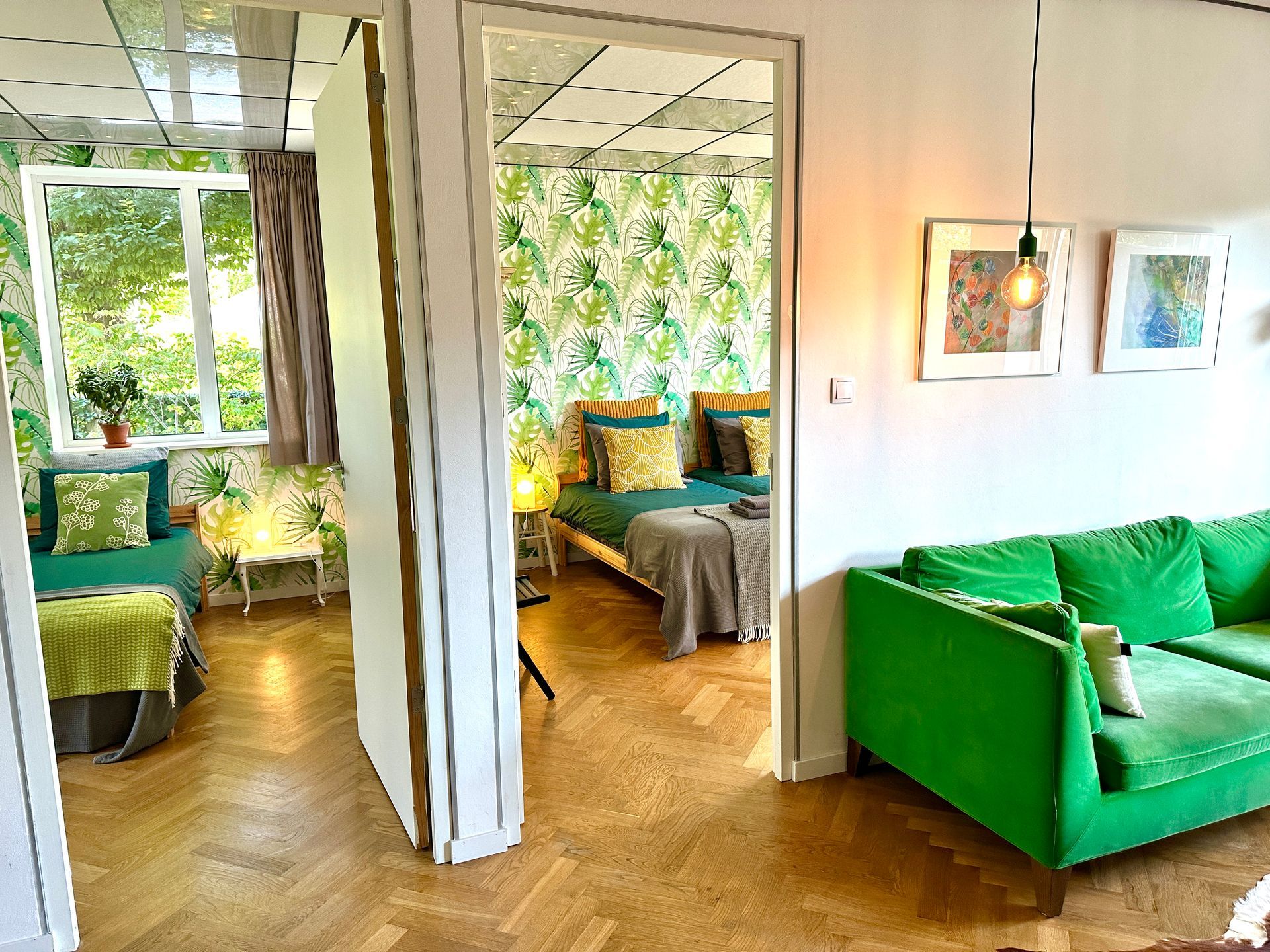 De Oude Kleuterschool has two rooms for two people. Both rooms are new, spacious, fresh and light. There are two single beds, with fine duvets and pillows. The beds are made at arrival. If